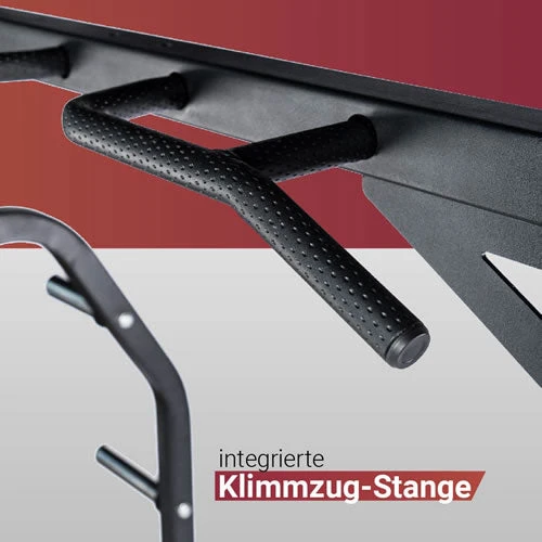 Der FUEL Fitness HR400 ist eine speziell für das Krafttraining mit der Langhantel konzipierte Kraftstation. Dank des integrierten Hantelscheibenständers sind die Hantelscheiben immer griffbereit und können zudem platzsparend gelagert werden. An dem äußerst stabilen Kniebeugeständer kann mit einem Gewicht von bis zu 272 kg trainiert werden. Langhantel- und Sicherheitsablage sind höhenverstellbar, so dass nahezu jede Übung mit der Langhantel optimal an dem FUEL HR400 Squat Rack ausgeführt werden. An der integrierten Klimmzugstange können alle möglichen Varianten von Pull-Ups trainiert werden.