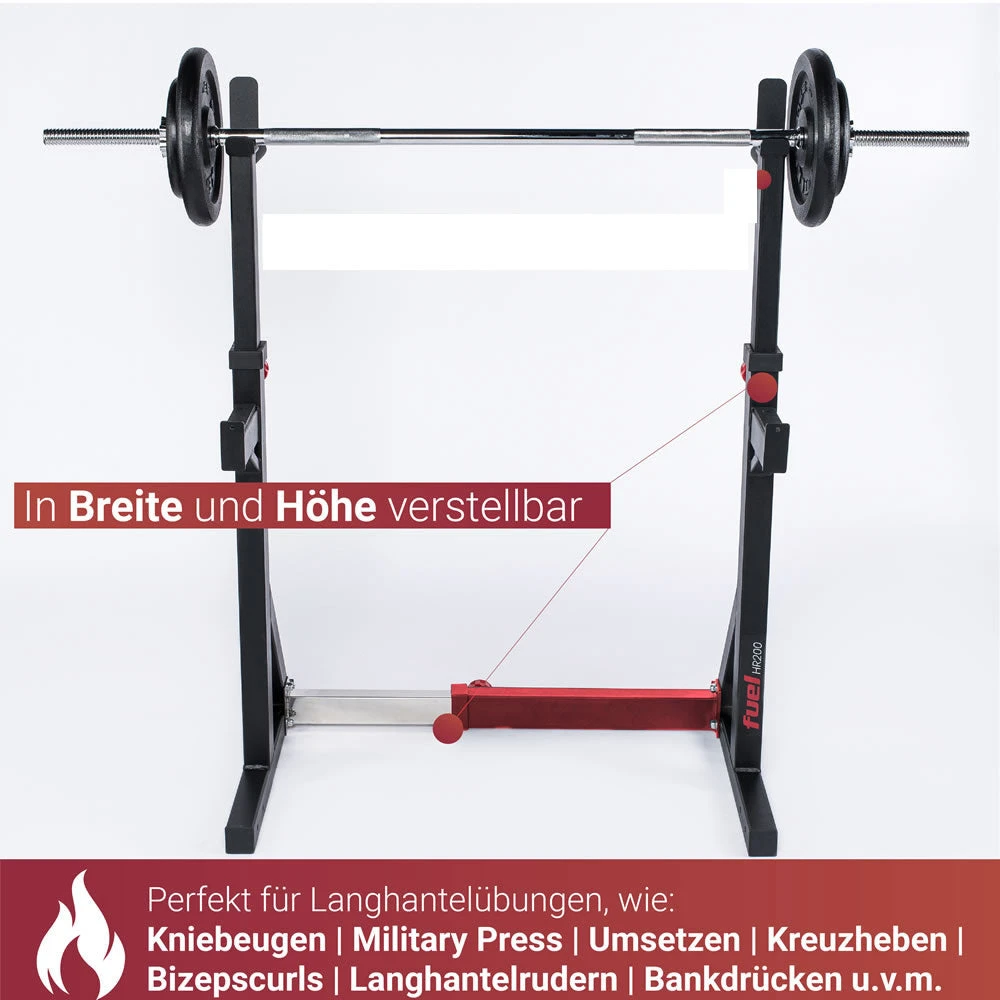 Die mehrfach verstellbare Langhantelablage HR200 ist ideal für ein umfassendes Langhanteltraining. Breite und Höhe der Langhantelablage ist einstellbar. Perfekt für ein Maximalkrafttraining mit hohen Gewichten, dank der maximalen Belastbarkeit von 180 kg. Dip-Griffe an den höhenverstellbaren Ablagen machen die FUEL Fitness HR200 zu einem vollwertigen Dip-Ständer.
