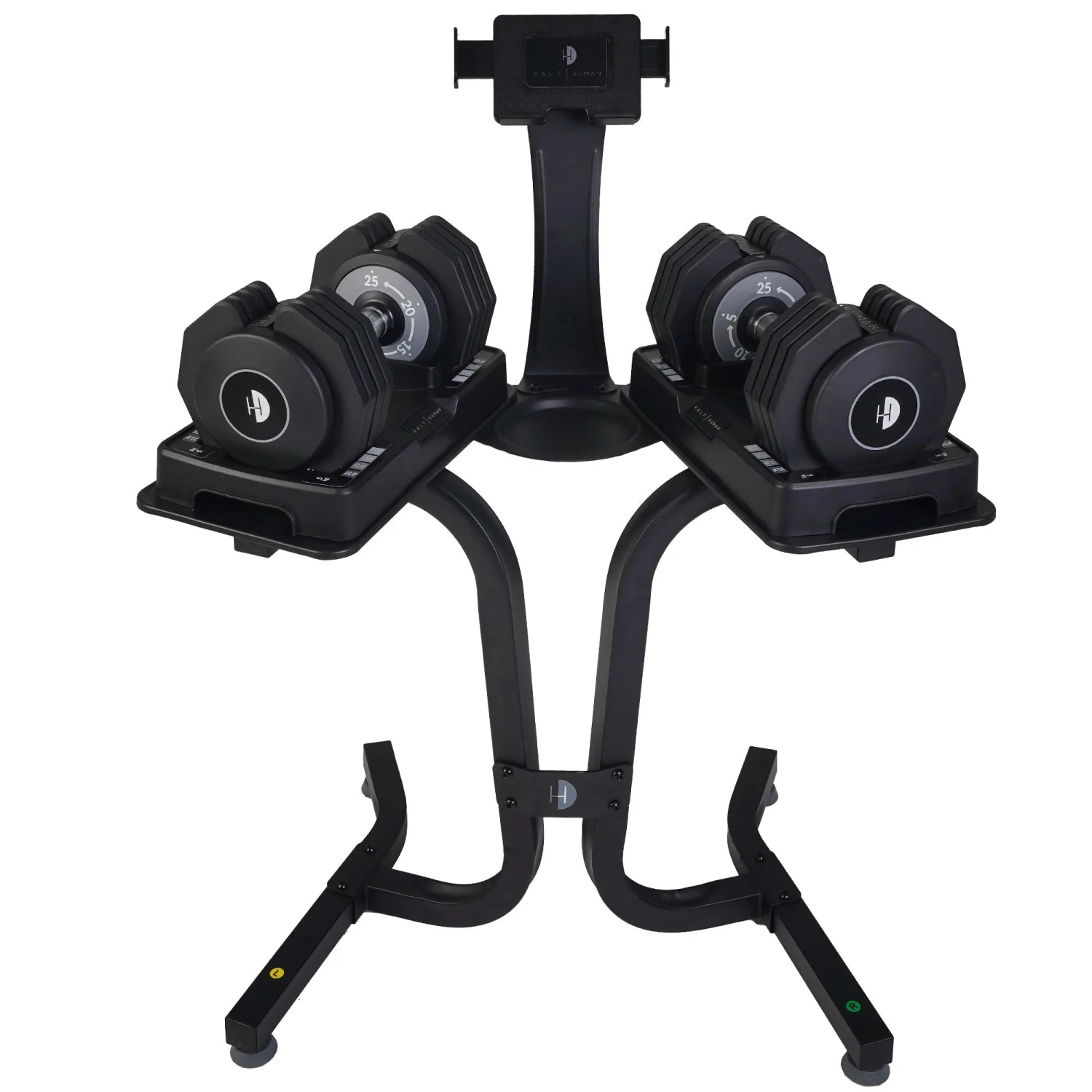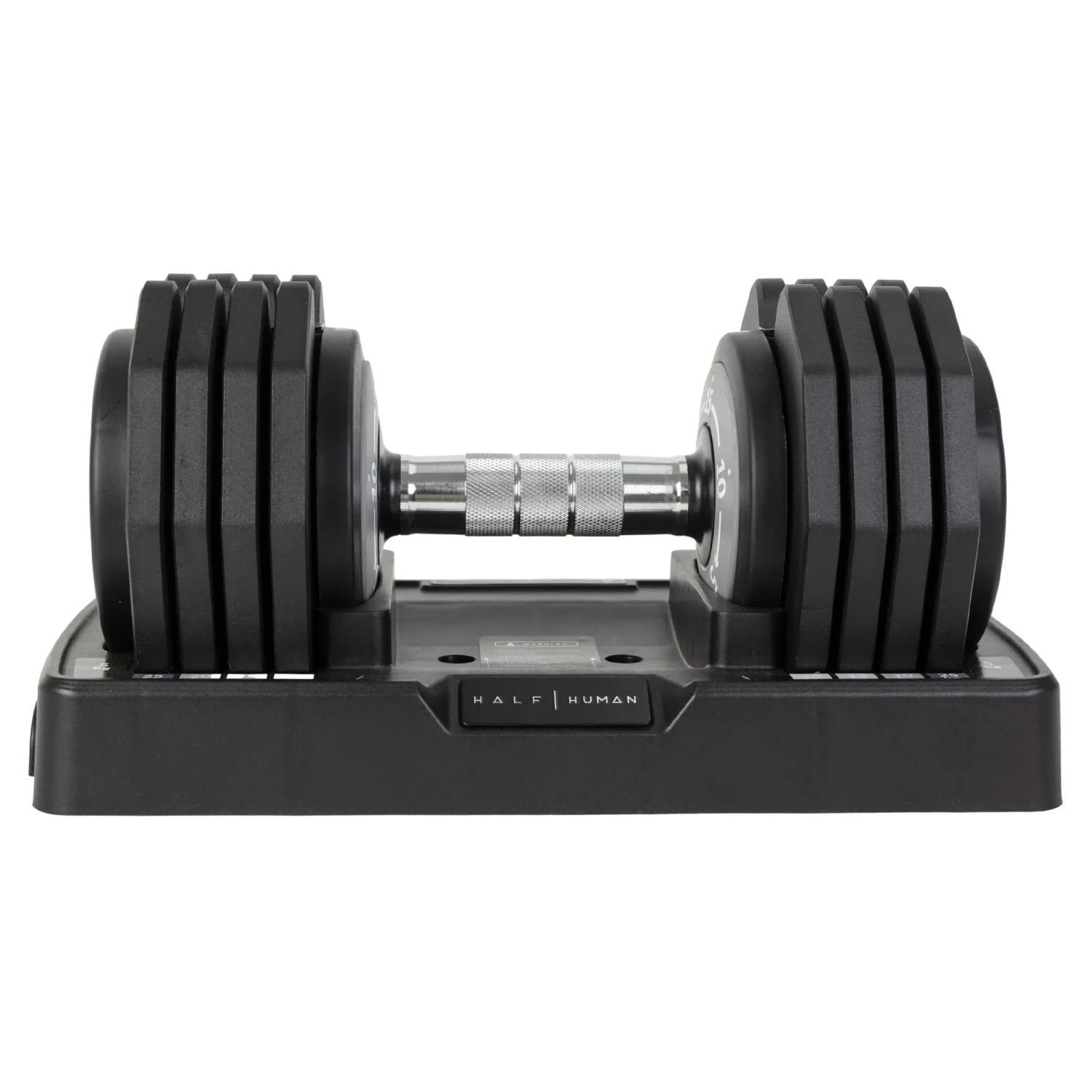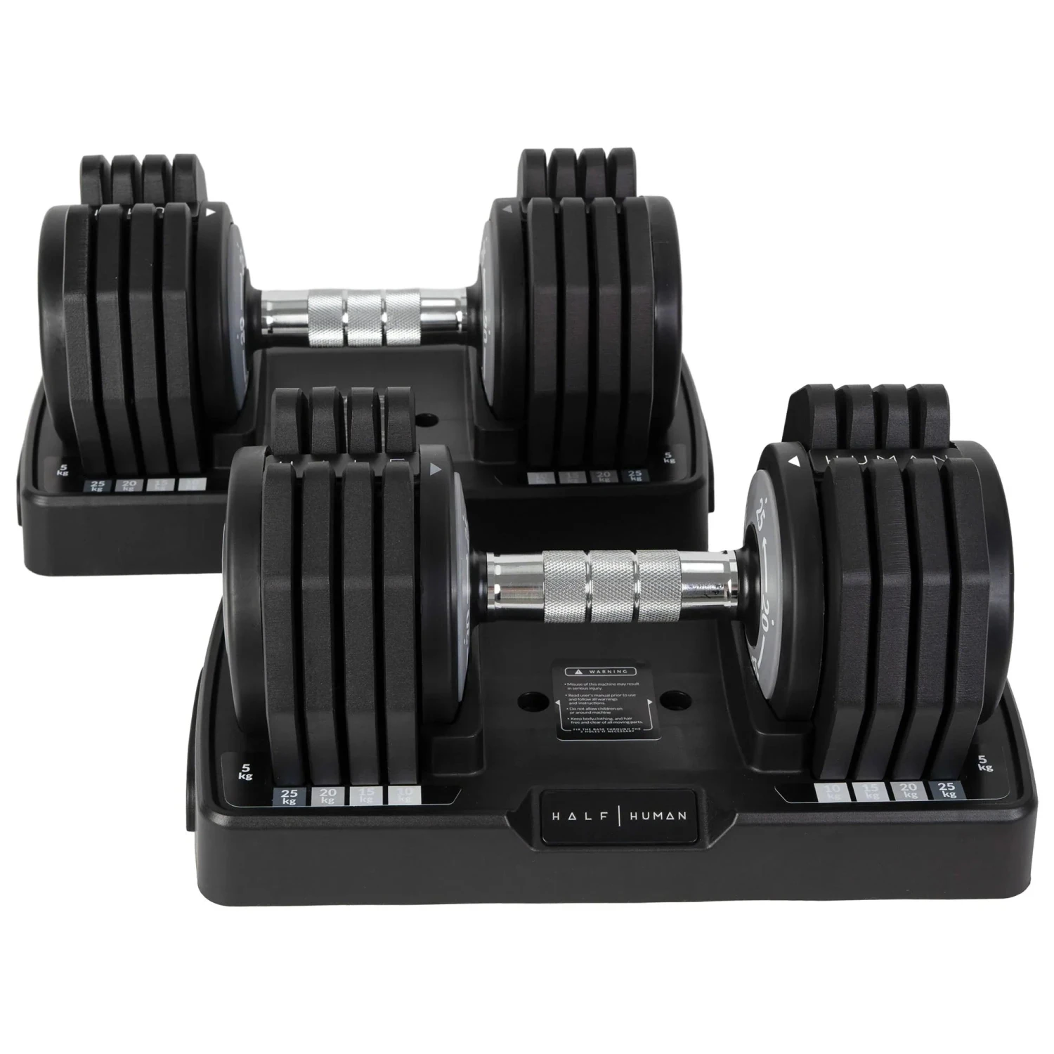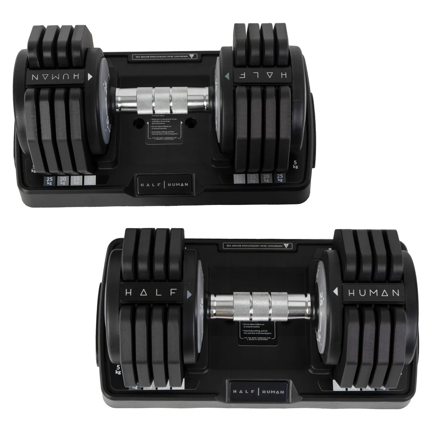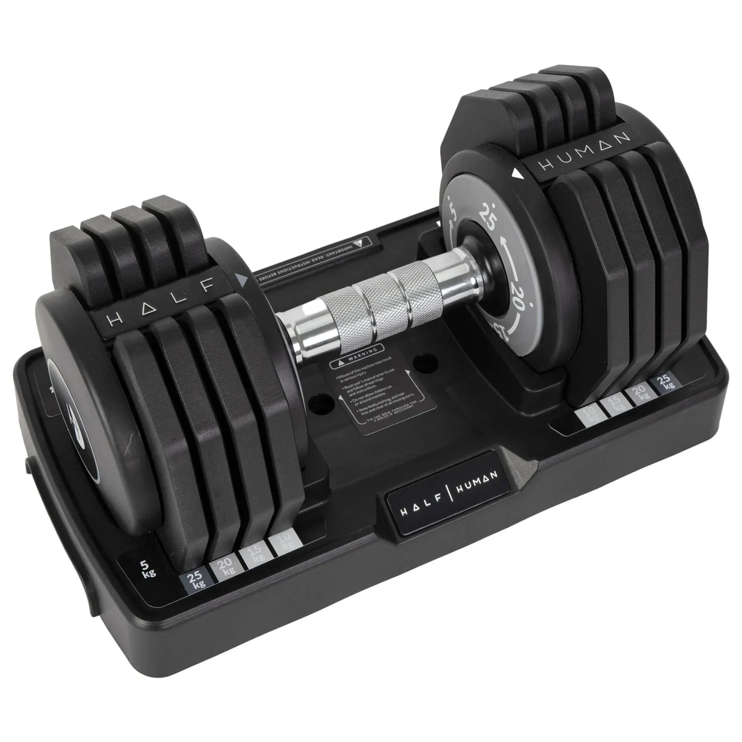 Das Half Human 25 kg verstellbare Hantel-Set mit einem Hantelständer bietet herausfordernde und effektive Krafttrainingseinheiten und liefert Ergebnisse für den gesamten Körper. Das Set ist perfekt für Heimfitnessstudios mit einem begrenztem Trainingsraum. Dazu hat es ein funktionales, kompaktes und tragbares Design. Es beinhaltet zwei 25 kg verstellbare Hanteln mit 5 Gewichtseinstellungen (5 kg, 10 kg, 15 kg, 20 kg und 25 kg), die vielseitige Trainingseinheiten für den maximalen Erfolg gewährleisten. Ein sicherer, rutschfester Griff wird durch einen gerändelten, konturierten Griff garantiert, während massiv gefertigte sechseckige Gewichtsplatten aus Stahl mit einem Anti-Roll-Design zusätzliche Sicherheit beim Training geben. Dank deutlicher Gewichtskennzeichnungen können schnelle Anpassungen vorgenommen werden. Die Hanteln werden mit einem praktischen Hantelständer geliefert, der über eine integrierte Halterung für Ihr Tablet oder Smartphone verfügt.