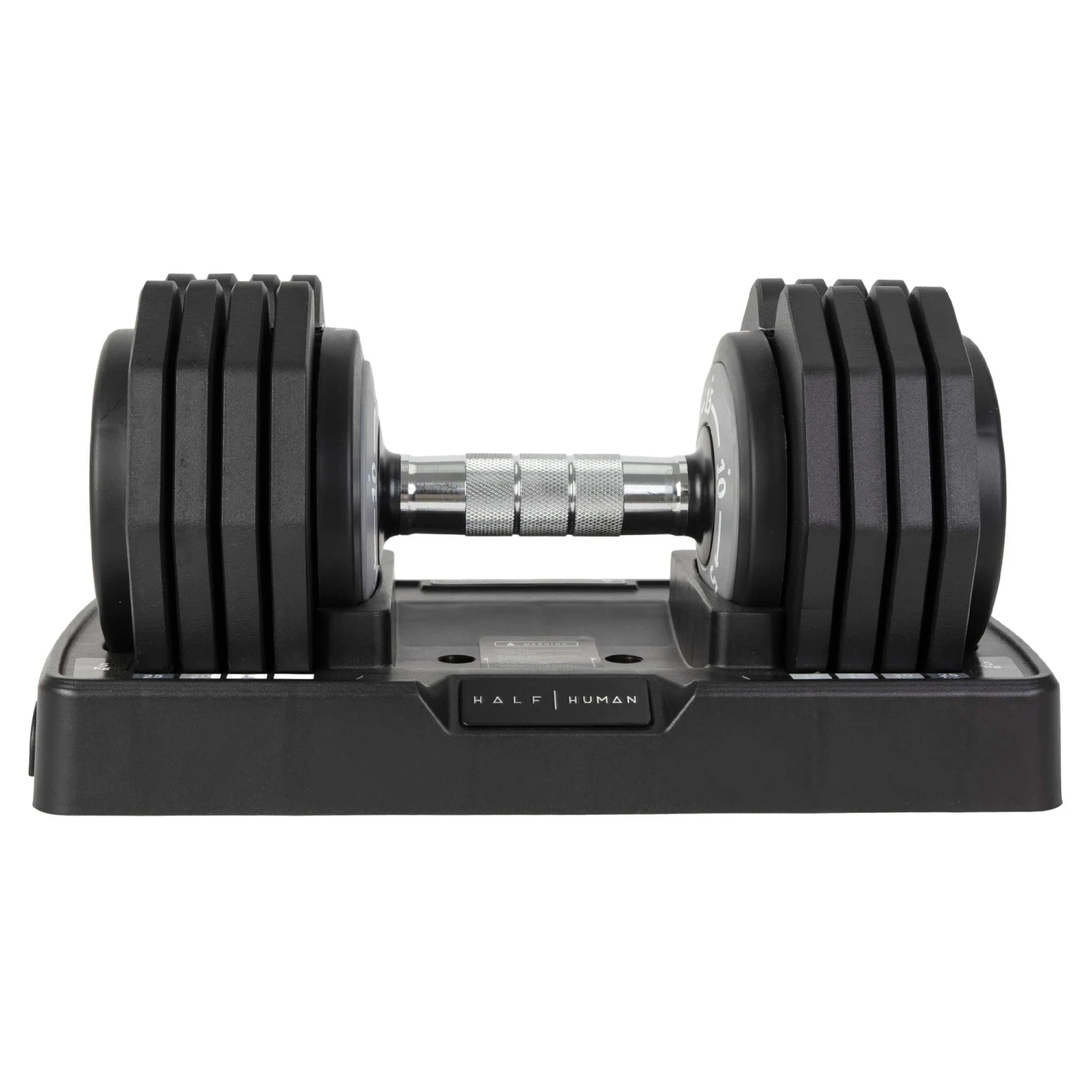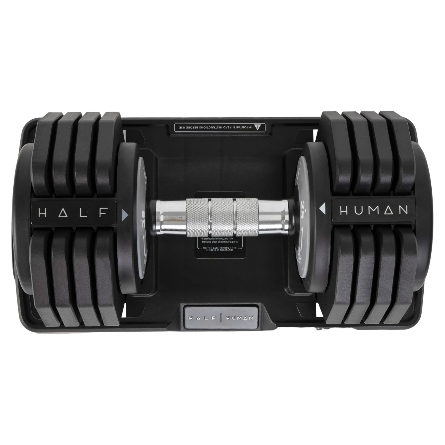Mit erhöhter Stabilisierung, Muskelaktivierung und Bewegungsfreiheit ist die Half Human 25 kg verstellbare Hantel perfekt für effektive Krafttrainingseinheiten geeignet, die Ergebnisse für den gesamten Körper liefern. Mit einem kompakten, platzsparenden Design ist diese robuste Hantel tragbar, funktional und hilft, wertvollen Platz in Ihrem Heimfitnessstudio zu sparen. Sie bietet 5 Gewichtsanpassungen (5 kg, 10 kg, 15 kg, 20 kg und 25 kg) und verfügt über einen gerändelten, konturierten Griff für einen festen und bequemen rutschfesten Halt. Die aus massivem Stahl gefertigten Sechskant-Gewichtsplatten sorgen für zusätzliche Sicherheit während der intensivsten Workouts und verhindern, dass die Hantel wegrollt. Außerdem gibt es deutliche Gewichtskennzeichnungen für schnelle und einfache Anpassungen. Die Hantel wird mit einem praktischen Aufbewahrungstablett geliefert.