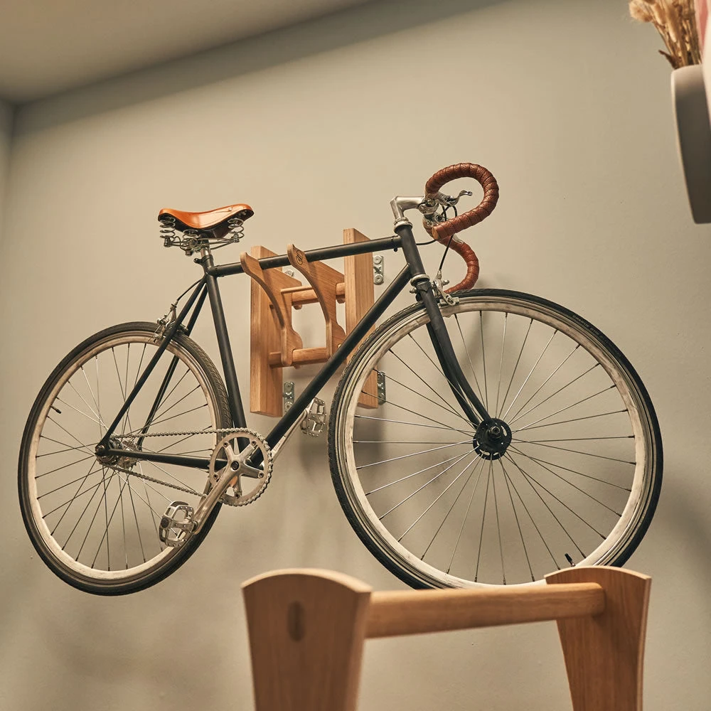 Immer wieder entwickelt Heimholz innovative neue Produkte aus Holz. So entstand auch die Mini-Sprossenwand, die zusammen mit dem Rennradhalter eine geniale und stylische Aufhängung für Ihr Fahrrad ist.