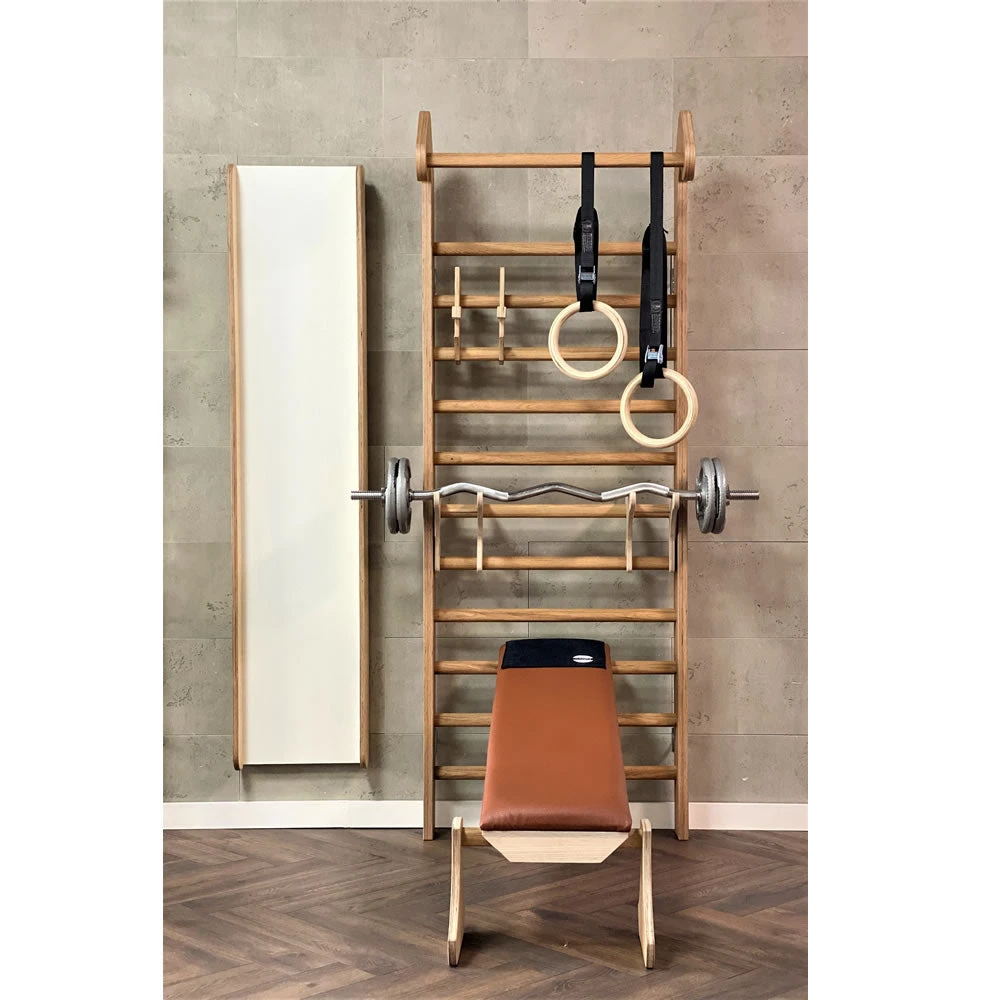 Die MURUM Echtholz Sprossenwand kann sowohl individuell angepasst werden wie auch mit zahlreichem Zubehör erweitert werden.