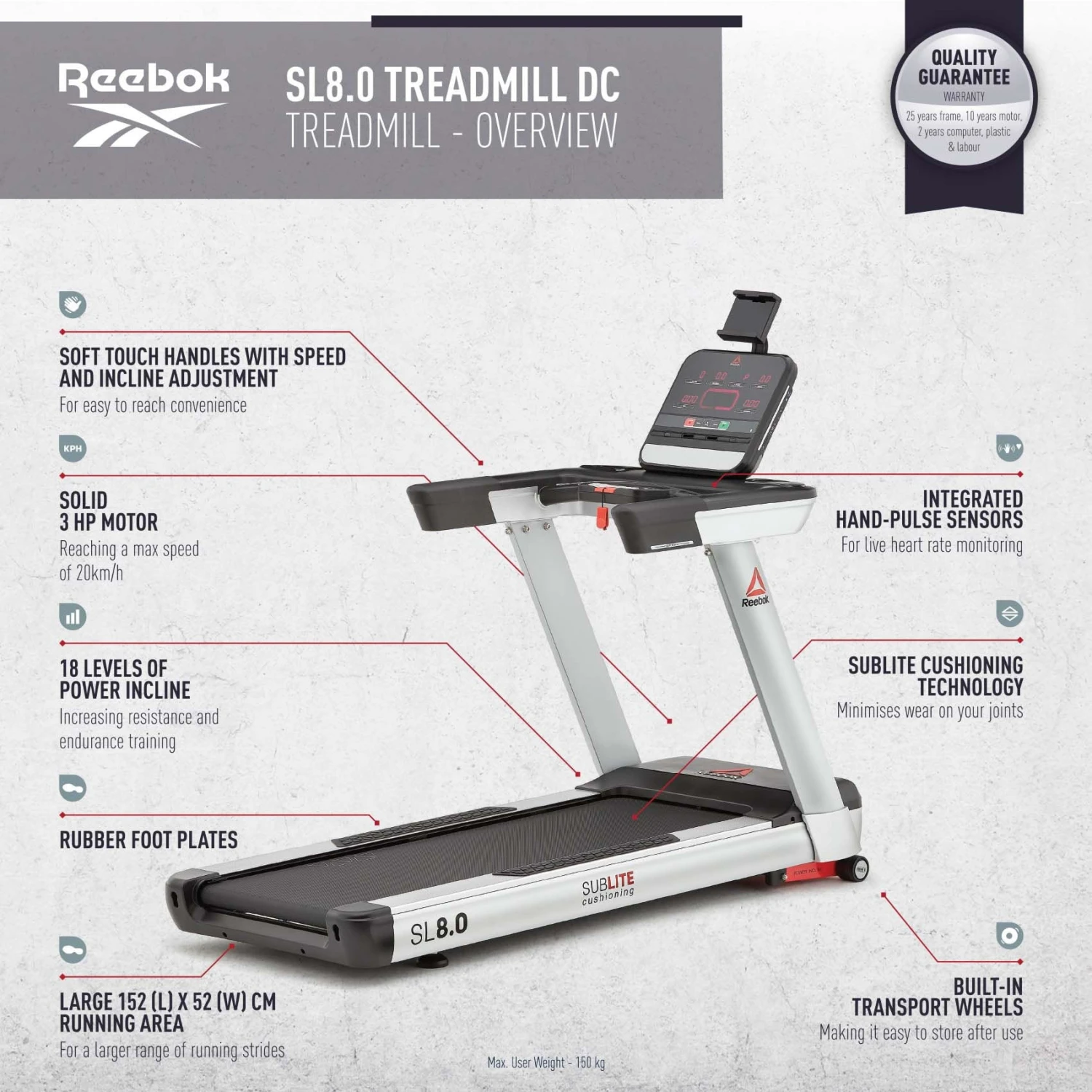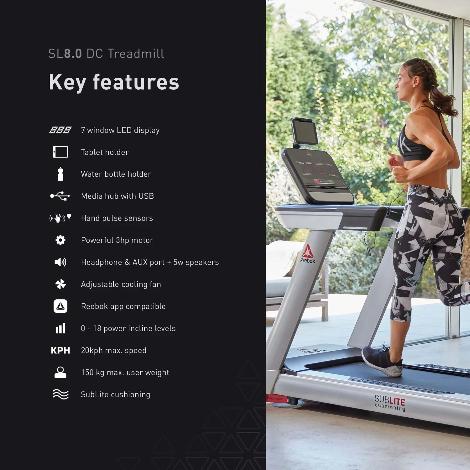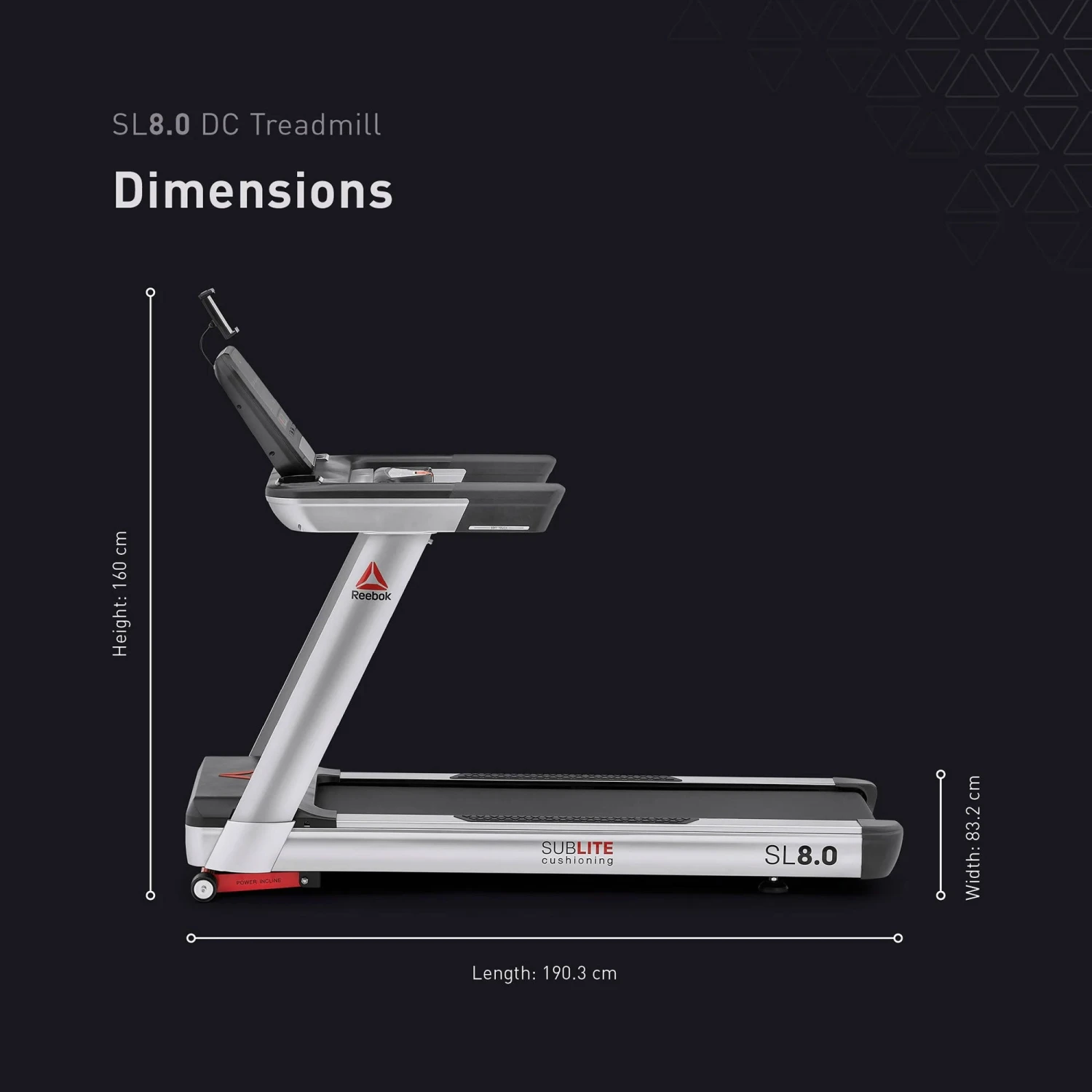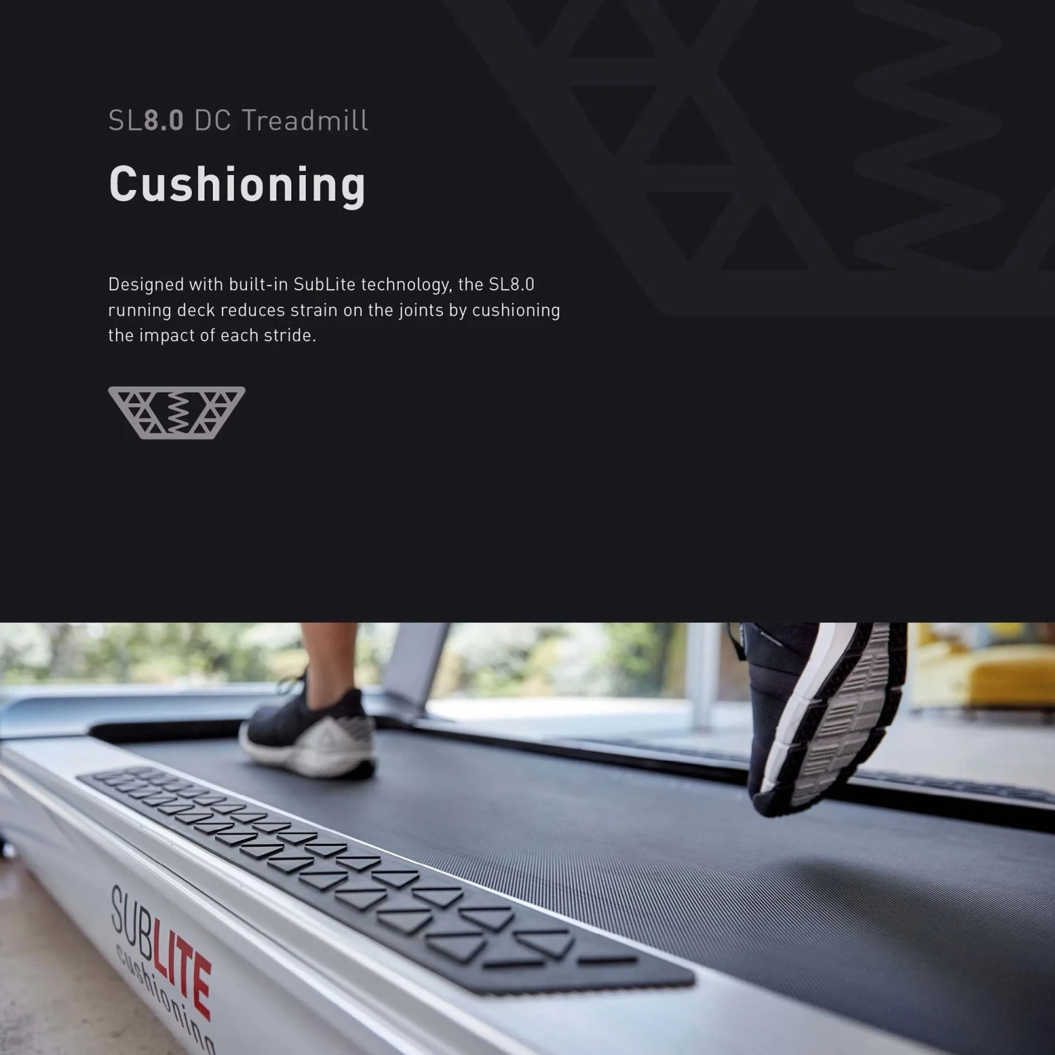 Das Laufband SL8.0 verfügt über einen leistungsstarken 3 PS DC-Motor, 20 km/h Höchstgeschwindigkeit, 18 Neigungsstufen und eine geräumige Lauffläche von 52 cm x 152 cm mit unterstützender SubLite-Dämpfung.