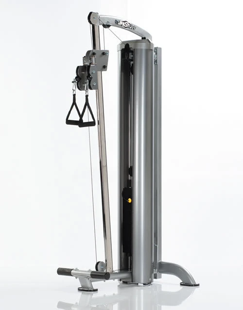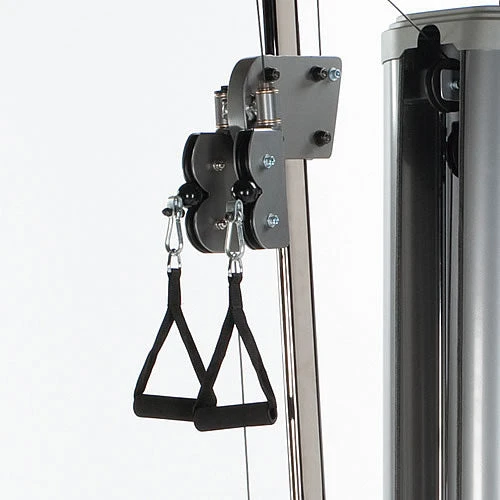 In 12 Positionen höhenverstellbarer Kabelzug mit zwei unabhängig voneinander arbeitenden Einzelseilzügen ermöglicht eine Vielzahl von Übungen wie Bauchcrunch, Zugübungen, Doppelzugübungen, Adduktoren, Abduktoren, Hüfte, Po-Muskulatur, Bizepztraining stehend und sitzend und Nackenzugübungen.