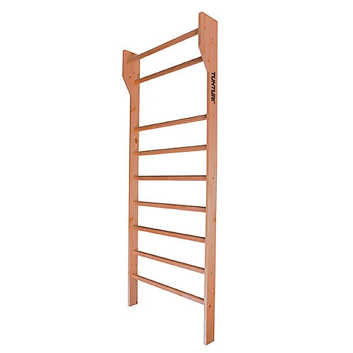 Die Tunturi Sprossenwand in der Größe 230 x 80 cm für Fitness- und Gymnastikübungen. Modell mit 10 Sprossen aus Birkenholz und Seitenteilen aus Kieferholz. Wie bei Sprossenwänden üblich ist die oberste Stufe nach vorne gesetzt.